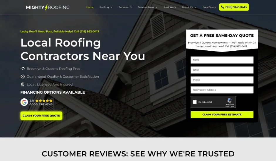 The Mighty Roofing site below nails what a high-performing, Google-ready website should look like. The H1 title — “Local Roofing Contractors Near You” — hits a powerful local keyword that homeowners in Brooklyn and Queens actually type when searching for help. It’s simple, direct, and built to rank. The bold “Claim Your Free Quote” button grabs attention right away, turning visitors into leads within seconds. Add in strong trust signals like 5-star reviews, clear service points, and financing options, and you’ve got a site that not only ranks — it converts.